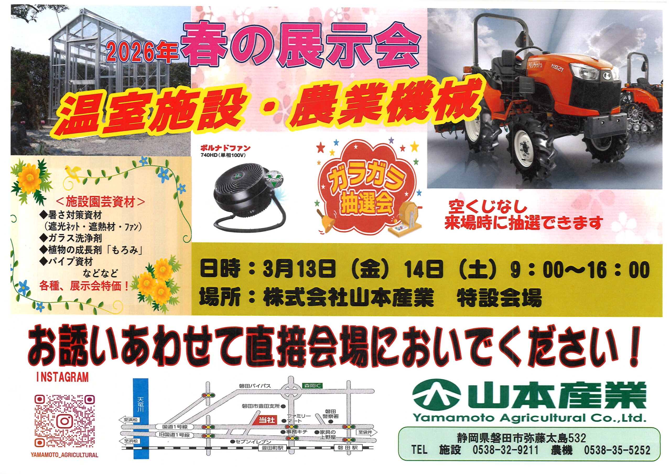 株式会社山本産業は、静岡県磐田市の温室施設(ガラス温室及びプラスチックフィルム温室等)の設計・施工・修理、トラクター・コンバイン・耕うん機等農業用機械の販売及び修理を行っております。